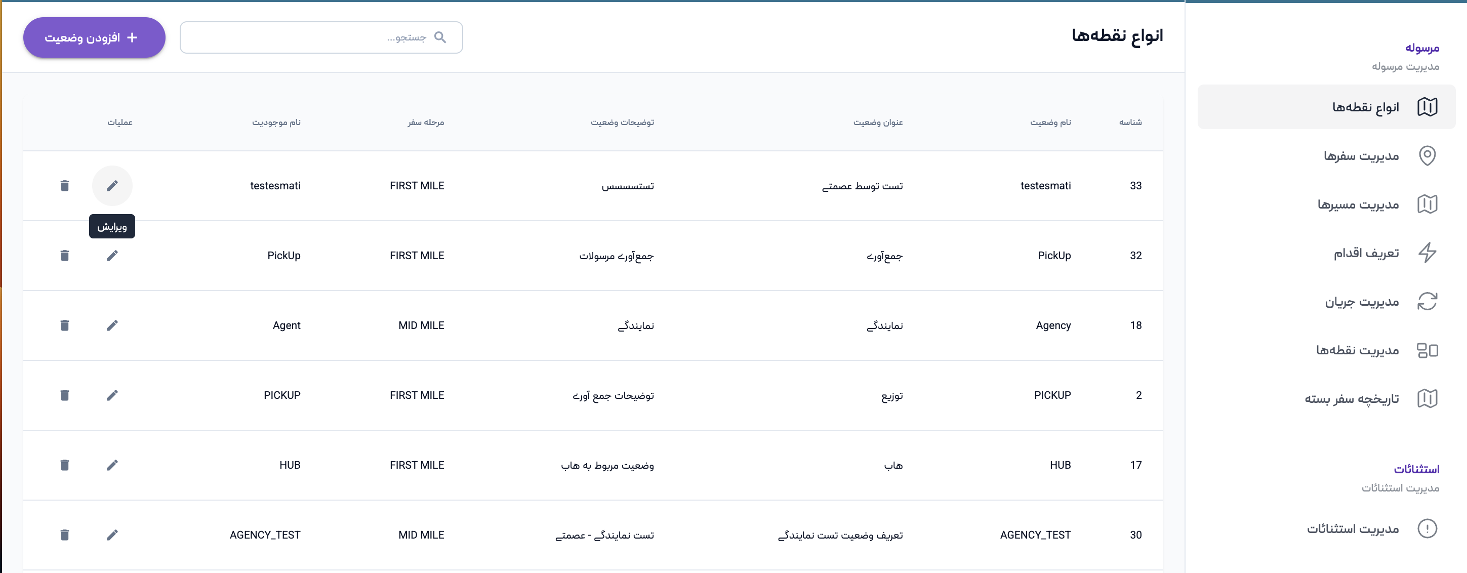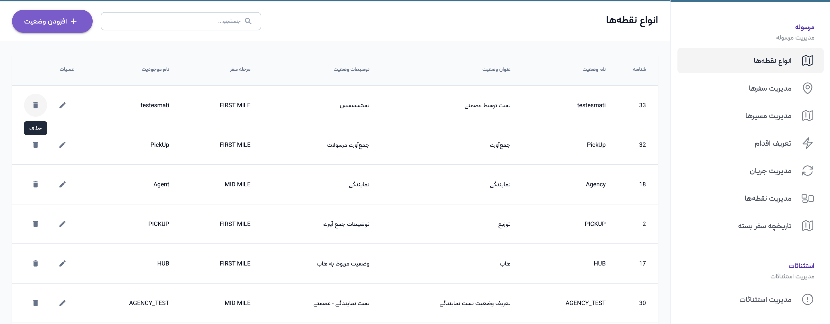 برای انواع نقطهها، پس از ورود به سامانه از منوی مرسوله وارد بخش انواع نقطهها شوید. در این صفحه، فهرست تمامی وضعیتهای تعریفشده نمایش داده میشود و امکان ایجاد، ویرایش و حذف آنها وجود دارد.