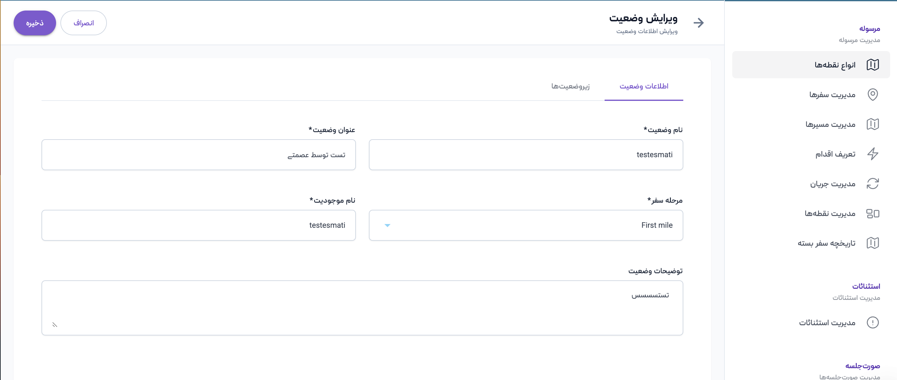 هنگامی که روی دکمه ویرایش کلیک کنید به صفحهای هدایت خواهید شد که حاوی دو تب است. یکی برای اطلاعات وضعیت و یکی برای اطلاعات زیروضعیتها. برای ویرایش اطلاعات وضعیت در تب آن تغییرات لازم را انجام دهید و سپس روی دکمه ذخیره کلیک نمایید تا اطلاعات آپدیت شوند.
