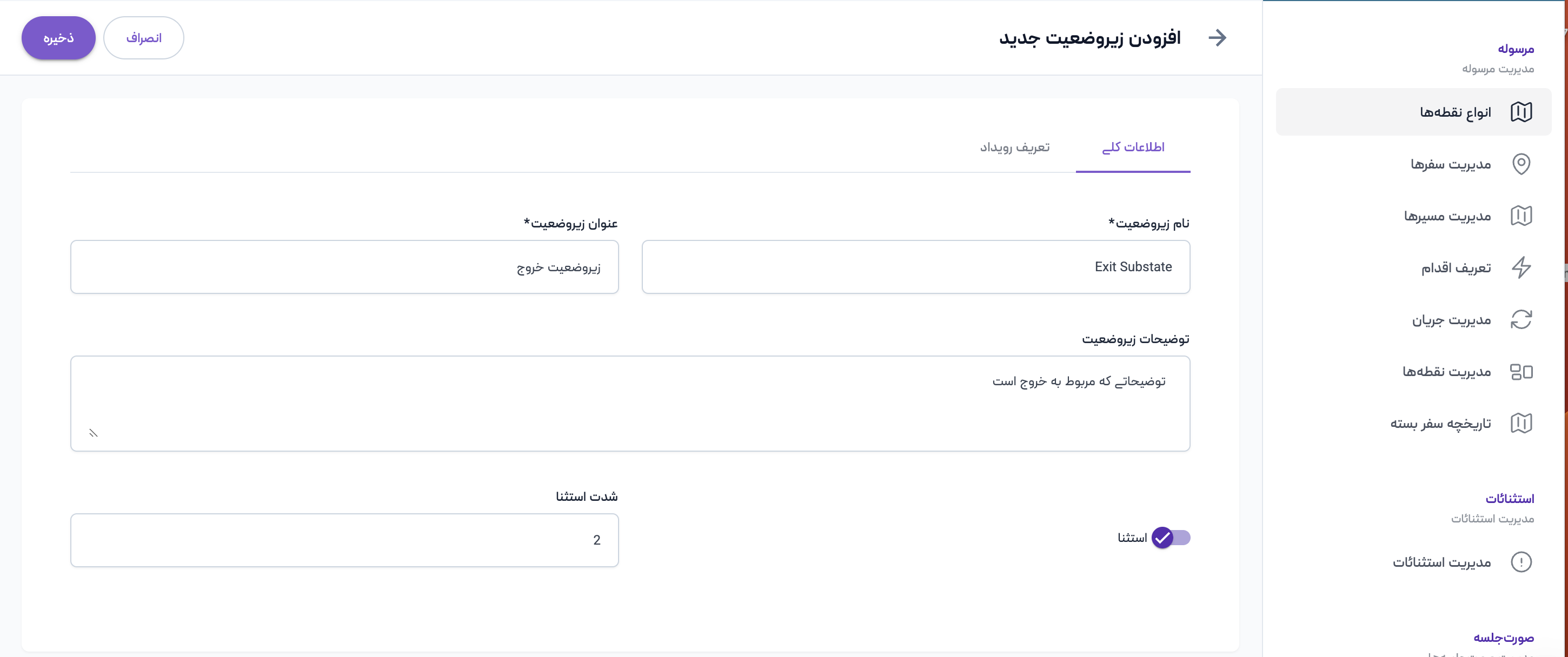 برای ایجاد زیروضعیت به تب زیروضعیتها که هنگام ویرایش یک وضعیت قابل مشاهده است بروید. سپس روی دکمه افزودن زیروضعیت کلیک کنید. در اینجا دو تب وجود دارد که پر کردن اولی یعنی اطلاعات کلی اجباری است اما تب دوم که مربوط به رویدادهاست، اختیاری است.