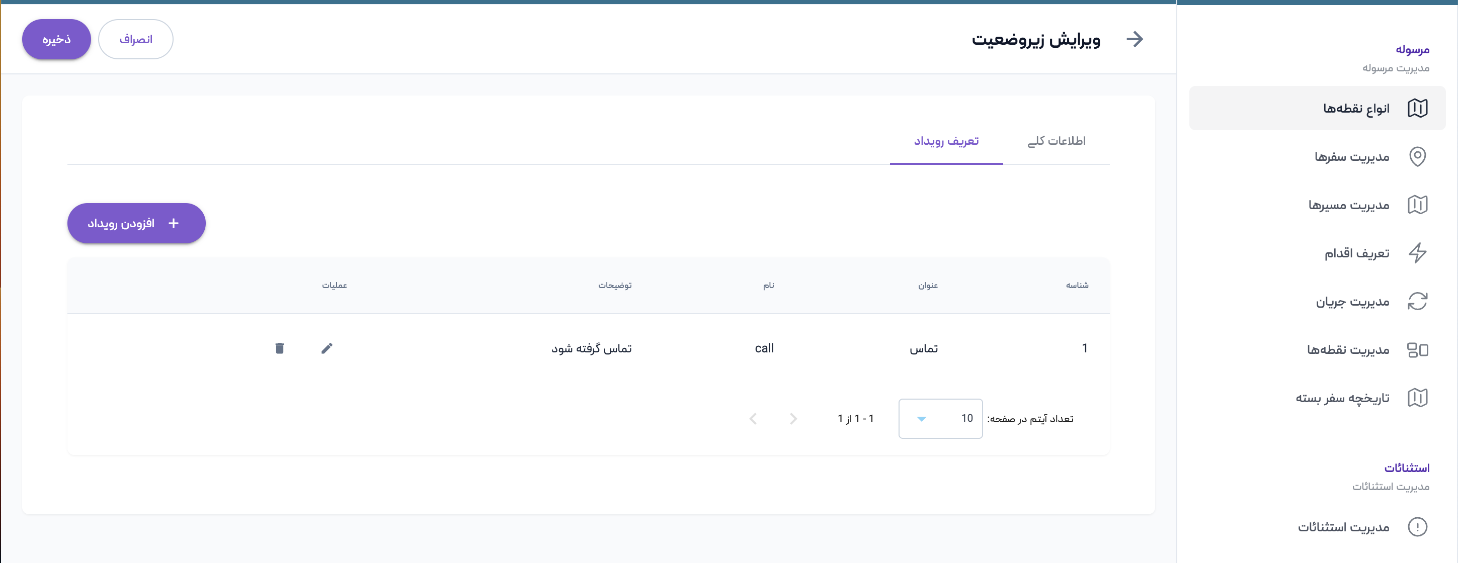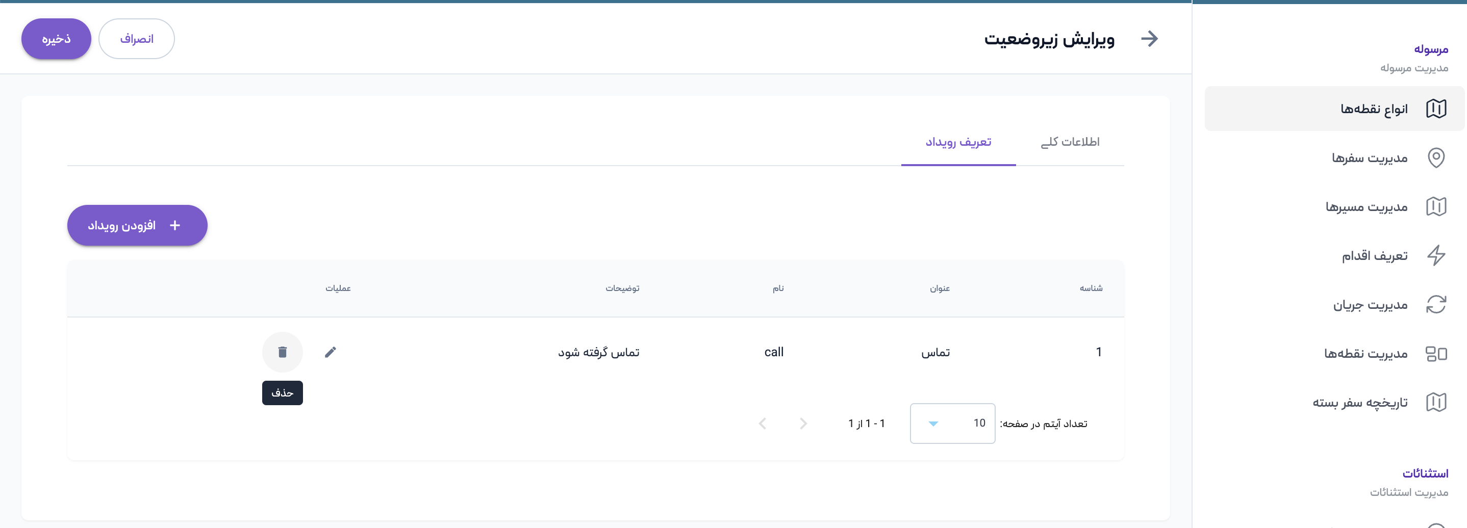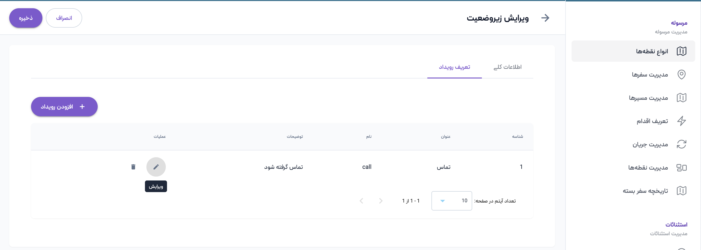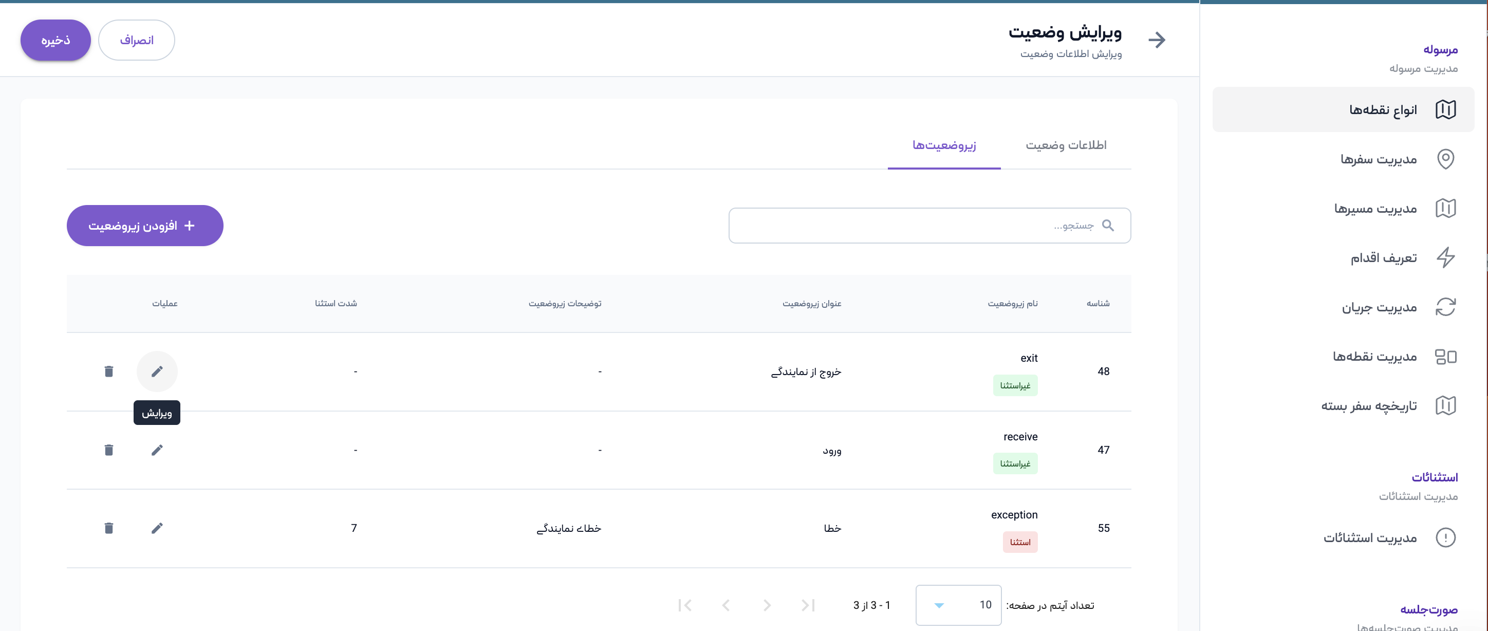 برای ویرایش زیروضعیت باید ابتدا آن را از لیست زیروضعیتها انتخاب نمایید، سپس روی دکمه ویرایش در ستون عملیات کلیک کنید. اکنون میتوانید اطلاعات زیروضعیت و رویدادهای مربوطه را ویرایش کنید و با انتخاب دکمه ذخیره، تغییرات را اعمال کنید،