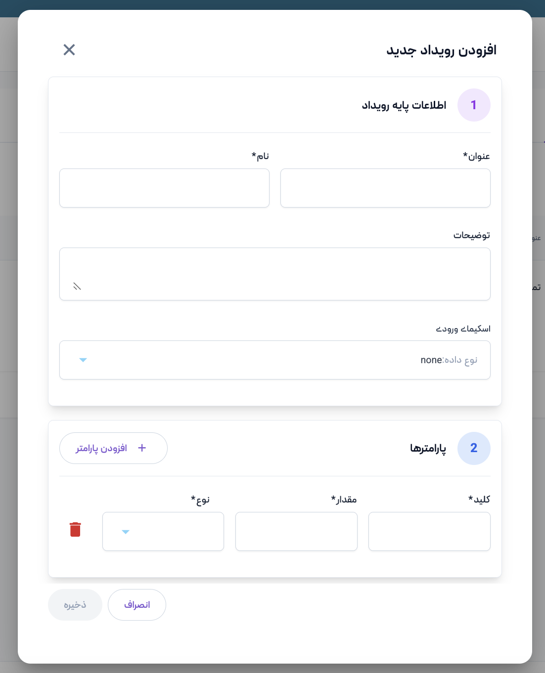 برای ایجاد رویداد جدید، به تب تعریف رویداد که هنگام ویرایش یک وضعیت قابل مشاهده است بروید. روی دکمه افزودن رویداد کلیک کنید. اطلاعاتی که باید وارد کنید از دو قسمت تشکیل شده است. اولی اطلاعات پایه رویداد و دومی پارامترهای آن است. برای قسمت اول باید عنوان، نام، توضیحات و اسکیمای ورودی رویداد را وارد کنید. قسمت دوم پارامترهاست که میتواند هر تعدادی باشد و شامل کلید، مقدار و نوع است. برای ایجاد پارامتر روی دکمه افزودن پارامتر کلیک کنید. پس از تکمیل اطلاعات روی دکمه ذخیره کلیک کنید. رویداد ایجاد شده و در لیست رویدادها قابل مشاهده است.