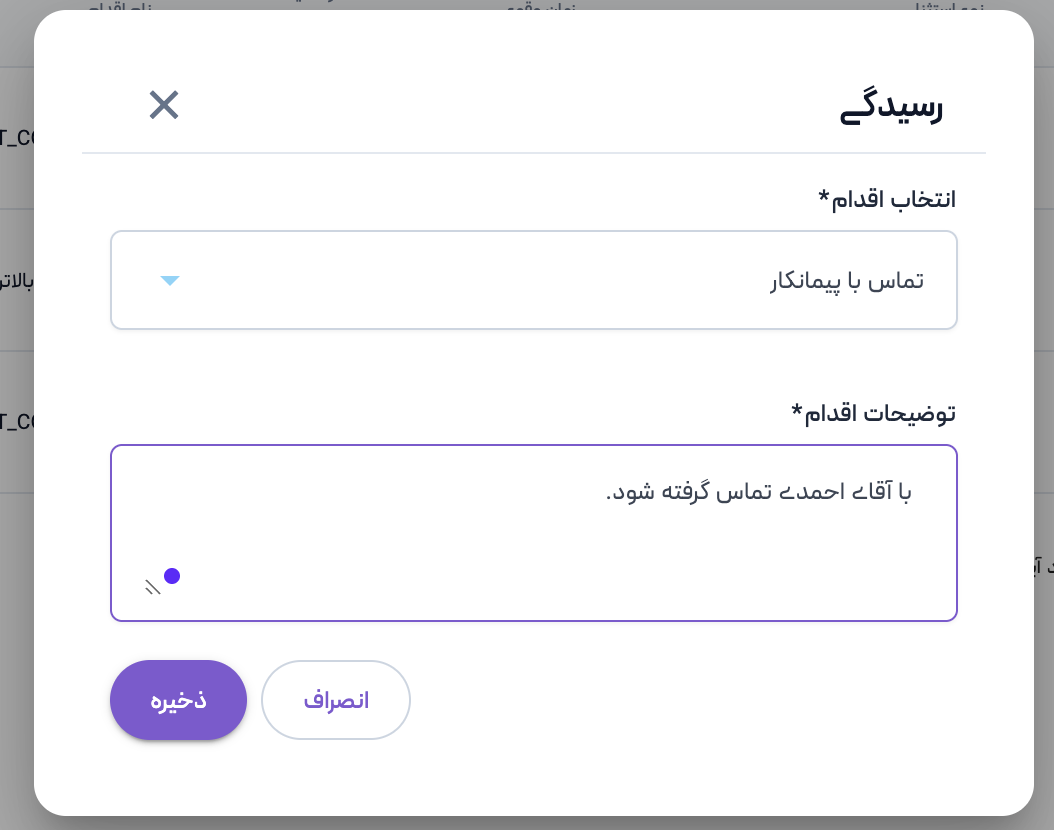 برای رسیدگی به استثنای رخ داده روی دکمه رسیدگی در ستون عملیات کلیک کنید. سپس نام و توضیحات اقدام مربوطه را وارد نمایید. پس از کلیک روی دکمه ذخیره به صفحه ثبت صورتجلسه برای استثنای رخ داده هدایت خواهید شد.