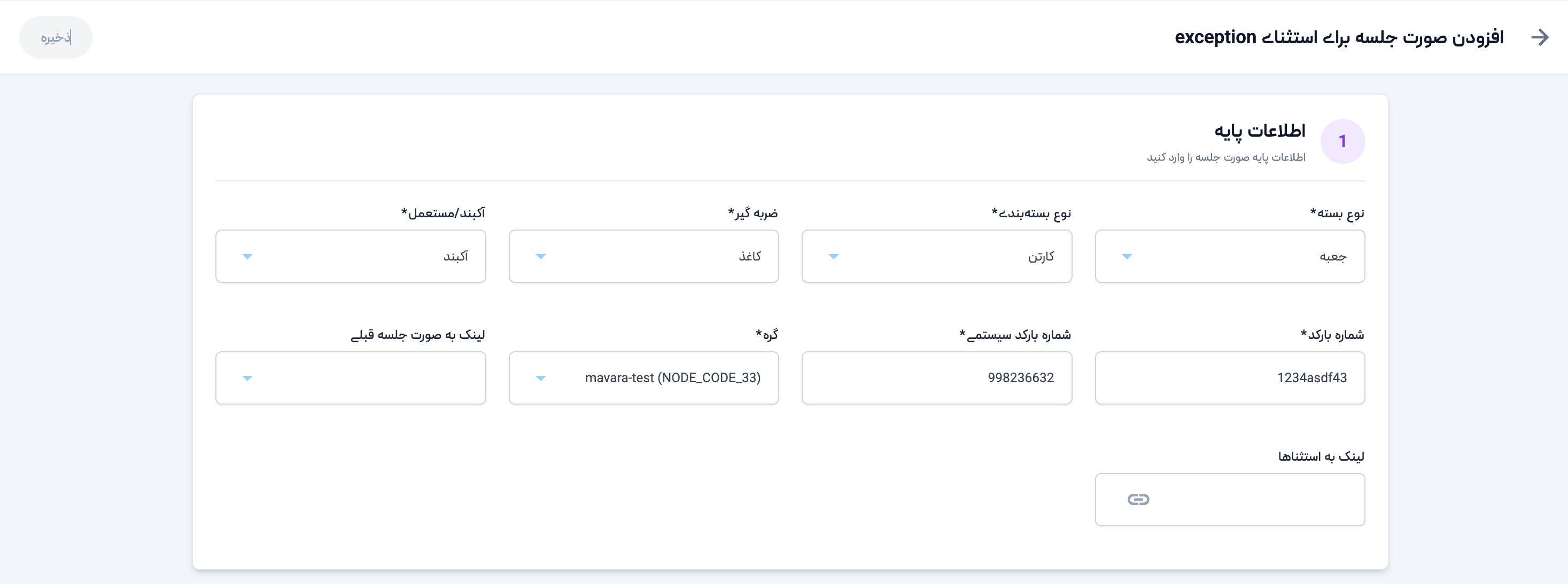 در قسمت اطلاعات پایه باید نوع بسته، نوع بستهبندی، ضربهگیر، آکبند/مستعمل، شماره بارکد، شماره بارکد سیستمی، گره مربوطه وارد شود. در صورتی که بخواهیم این صورت جلسه را به صورت جلسه هایی که از قبل ذخیره شده لینک کنیم میتوانیم از لیست صورتجلسات یکی را انتخاب کنیم و فیلدها با اطلاعات آن پر میشود. همچنین میتوان به یک یا چند استثنا این صورتجلسه را مربوط کرد.