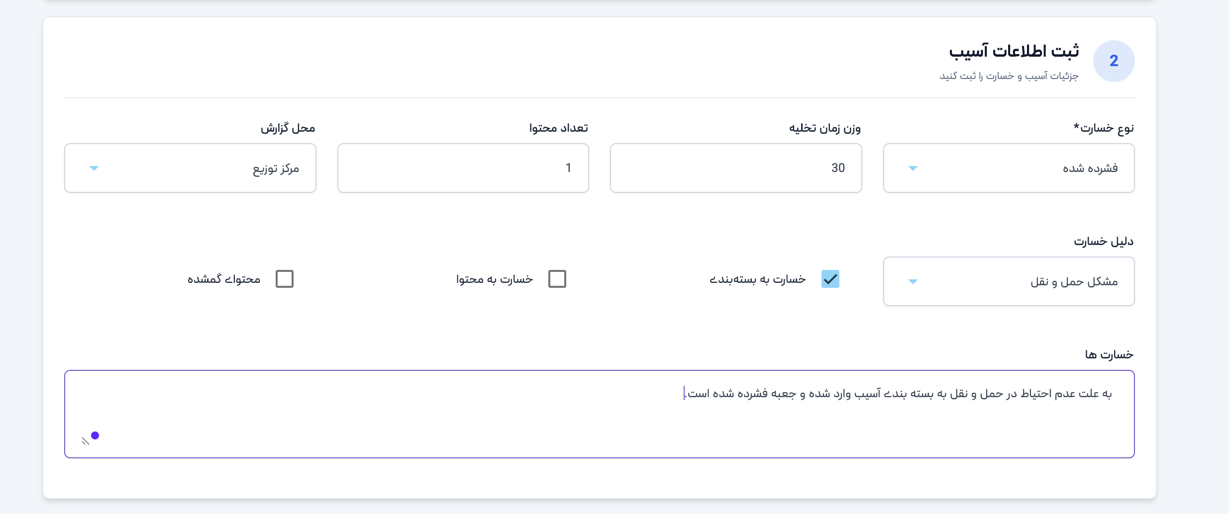 در قسمت اطلاعات آسیب باید نوع خسارت، وزن زمان تخلیه، تعداد محتوا، محل گزارش، دلیل خسارت، اینکه آیا به بسته بندی یا محتوا خسارت وارد شده؟ آیا محتوا گمشده؟ و لیست خسارات را وارد نمایید.