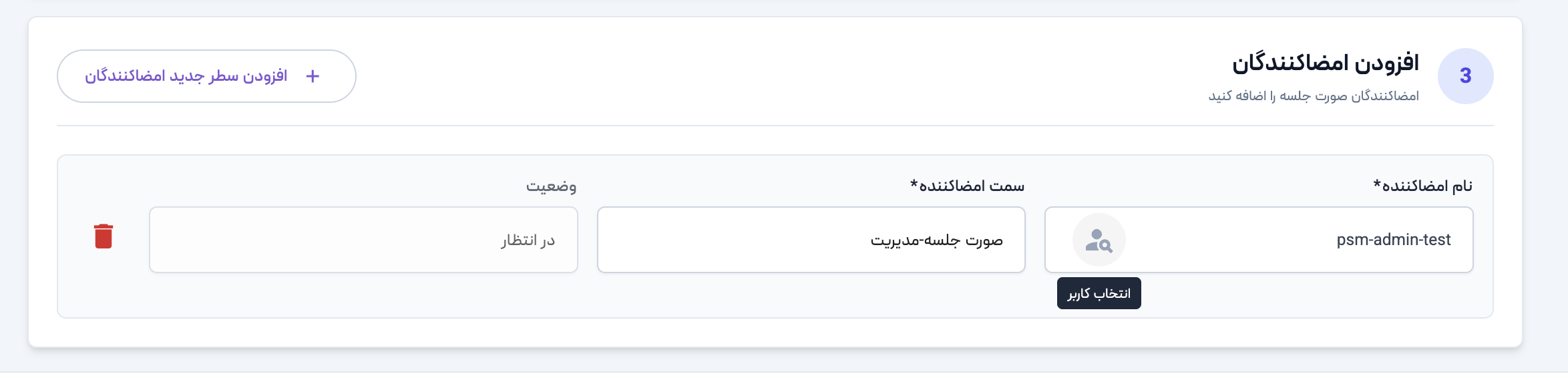 در قسمت امضاکنندگان نیز باید امضاکنندگان این صورت جلسه مشخص شوند. امکان وارد کردن یک یا بیشتر امضاکننده به هر صورتجلسه وجود دارد. برای این کار باید روی دکمه انتخاب کاربر کلیک شود، سپس از لیست کاربران نمایش داده شده یکی از کاربران انتخاب شود تا با کلیک روی دکمه انتخاب، نام و سمت آن در فیلدهای مربوطه پر شوند. همچنین امکان حذف یک سطر از امضاکنندگان نیز وجود دارد.
