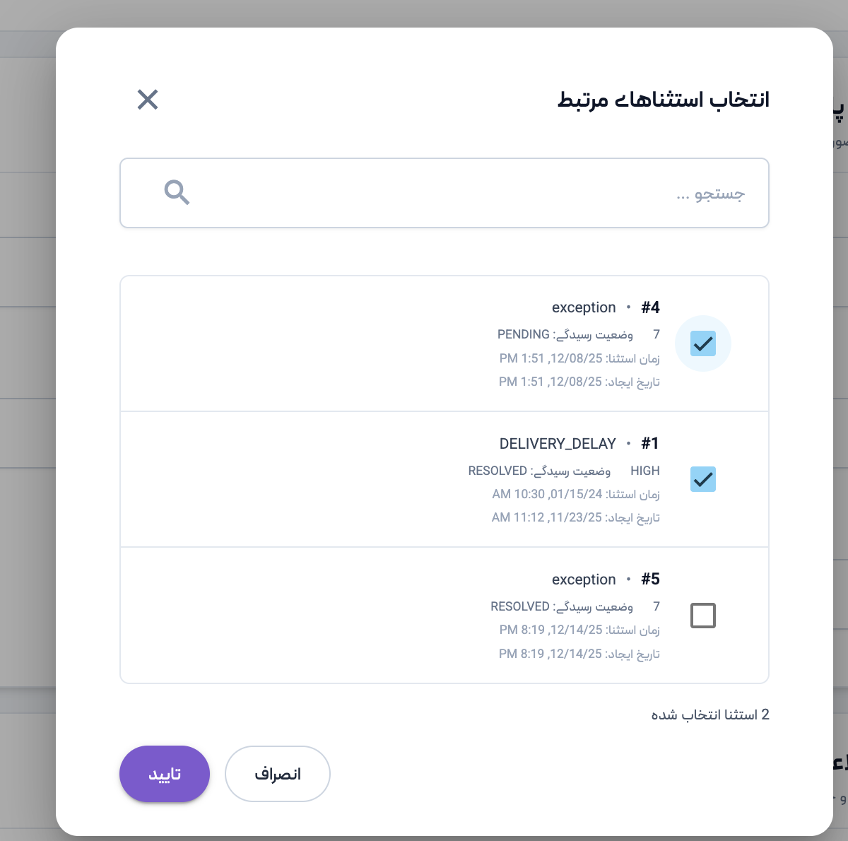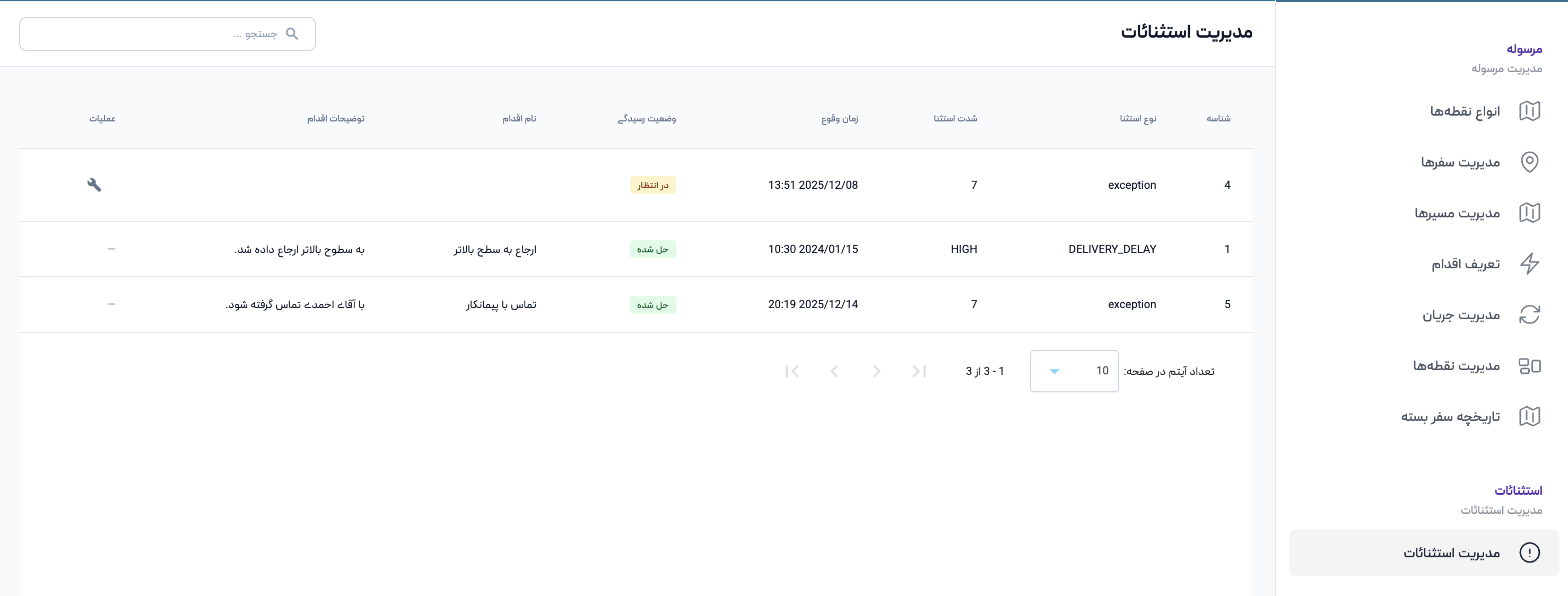 برای مدیریت استثنائات، پس از ورود به سامانه، از منوی استثنائات وارد بخش مدیریت استثنائات شوید. در این صفحه، فهرست تمامی استثنائات رخ داده در سامانه نمایش داده میشود و امکان مشاهده و رسیدگی به استثنای رخ داده وجود دارد.