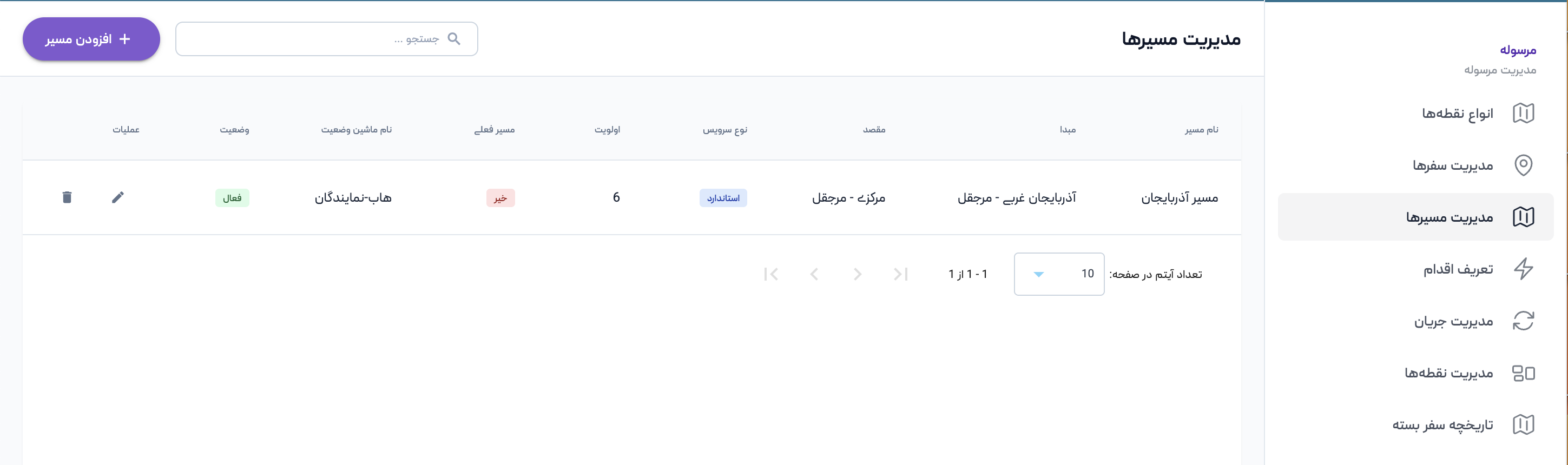 برای مدیریت مسیرها، پس از ورود به سامانه از منوی مرسوله وارد بخش مدیریت مسیرها شوید. در این صفحه، فهرست تمامی مسیرهای تعریفشده نمایش داده میشود و امکان ایجاد، ویرایش و حذف آنها وجود دارد.