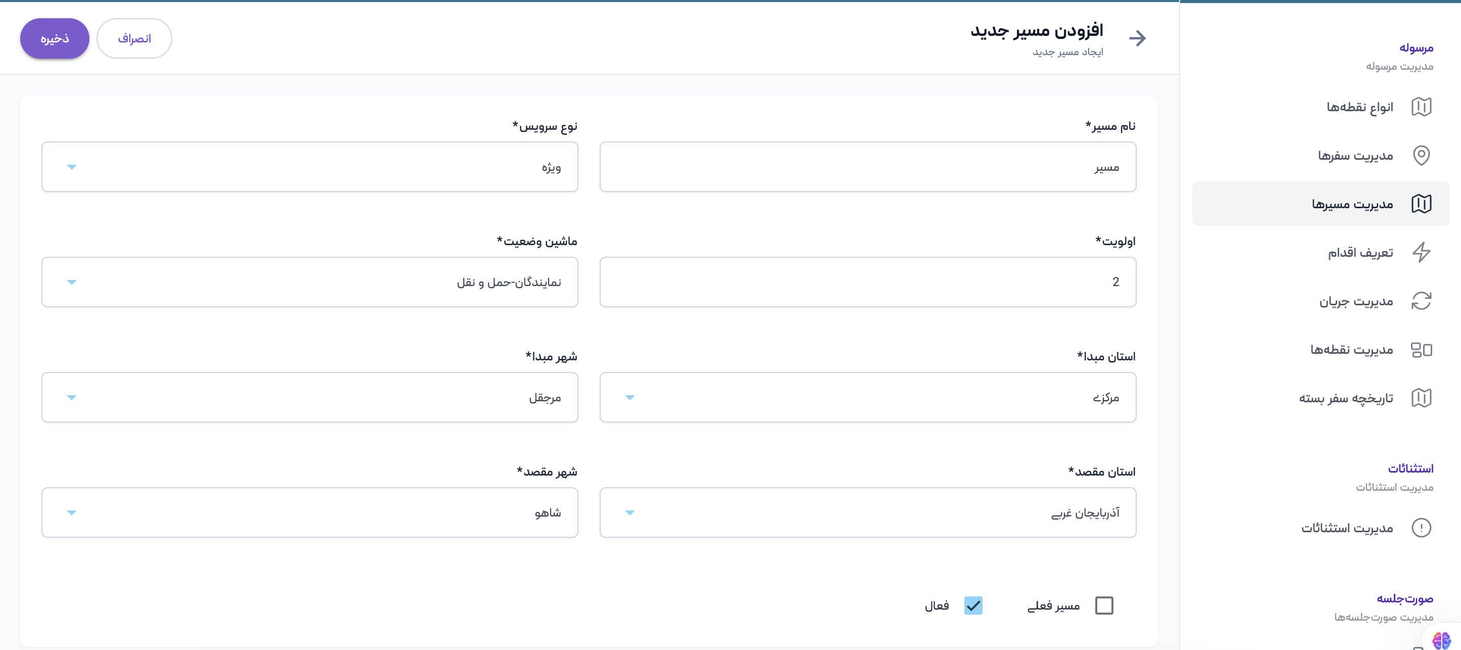 اطلاعاتی مانند نام مسیر، نوع سرویس، ماشین وضعیت، اولویت، استان و شهر مبدا و مقصد، اینکه آیا مسیر فعلی است؟ آیا مسیر فعال است؟ را مشخص کرده و دکمه ذخیره را انتخاب نمایید تا مسیر تعریف شده در لیست مسیرها نمایش داده شود.
