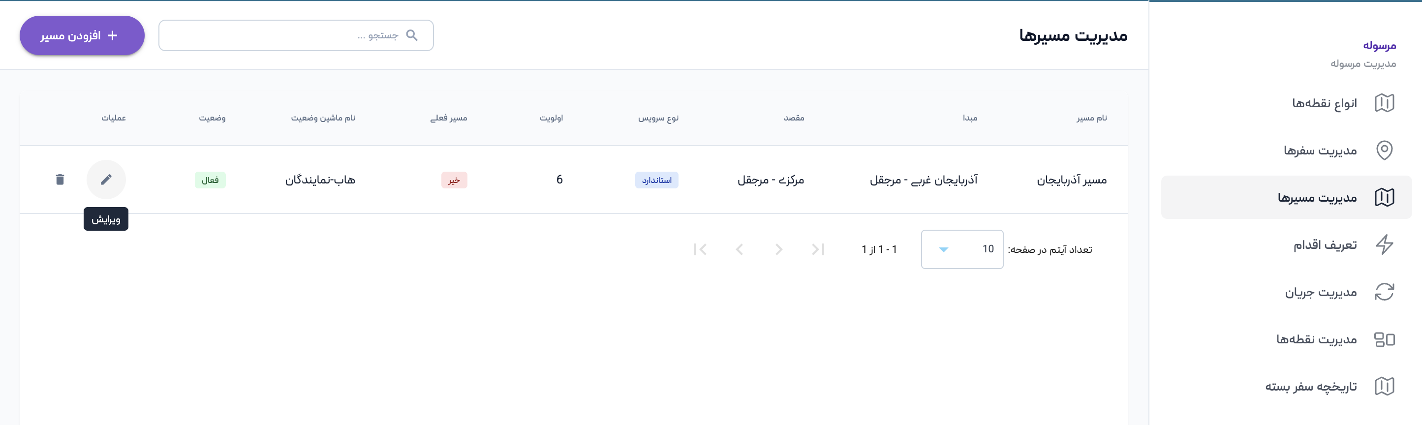 برای ویرایش اطلاعات یک مسیر، ابتدا مسیر مدنظر را از لیست مسیرها انتخاب نمایید. سپس روی دکمه ویرایش در ستون عملیات کلیک کنید. اطلاعاتی که نیاز به تغییر آن هست را ویرایش کرده و مجدد دکمه ذخیره را انتخاب نمایید. با این کار اطلاعات مسیر آپدیت میشود و اطلاعات جدید در لیست مسیرها نمایان خواهد شد.