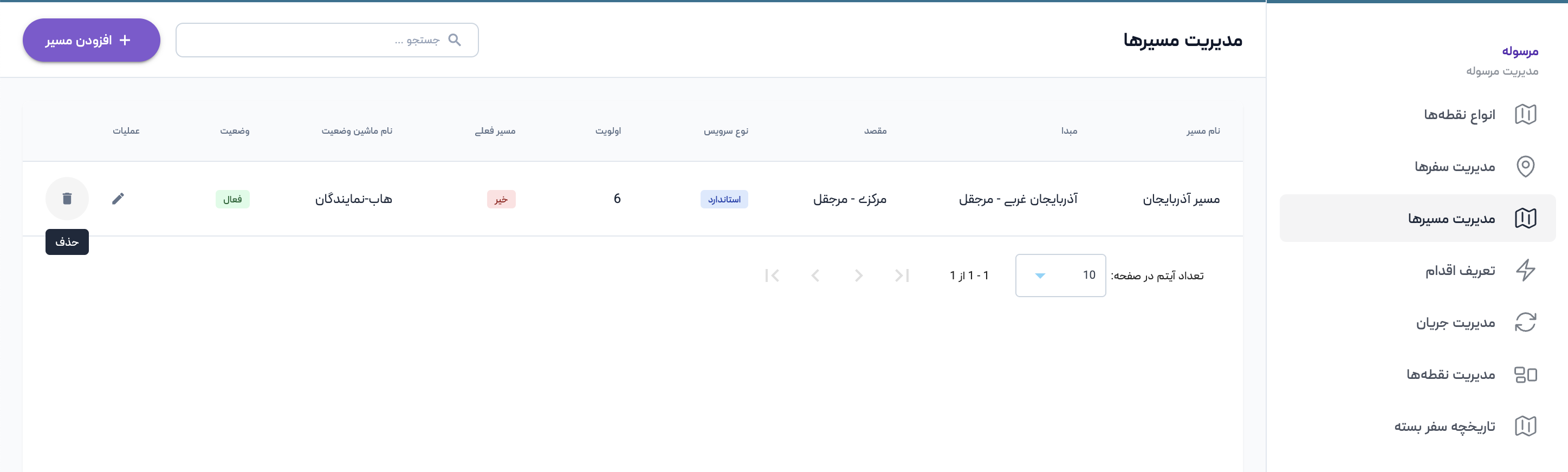 برای حذف مسیر مدنظر، ابتدا آن را از لیست مسیرها انتخاب نمایید. سپس روی دکمه حذف در ستون عملیات کلیک کنید و در صورت تایید عملیات در صورتی که از نظر سیستمی مشکلی برای حذف این مسیر وجود نداشته باشد، مسیر با موفقیت حذف خواهد شد.