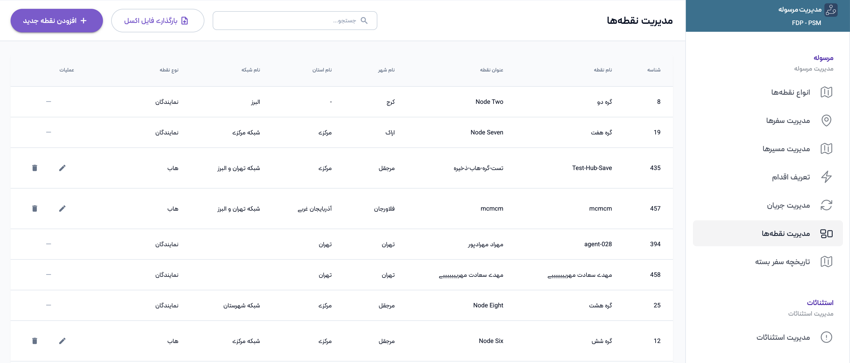 برای مدیریت نقطهها، پس از ورود به سامانه از منوی مرسوله وارد بخش مدیریت نقطهها شوید. در این صفحه، فهرست تمامی نقاط تعریفشده نمایش داده میشود و امکان ایجاد، ویرایش و حذف آنها وجود دارد.