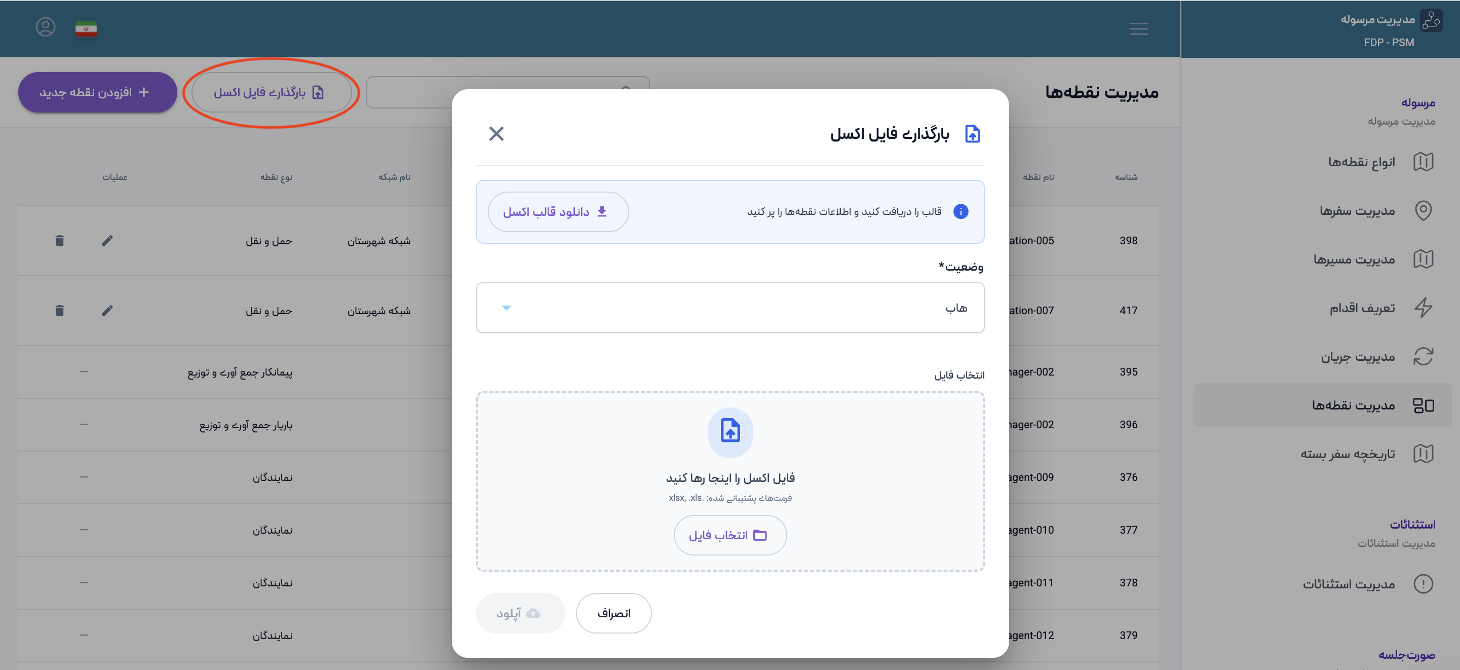 به منظور سرعت بالاتر امکان بارگذاری فایل اکسل برای وارد کردن دستهای نقاط وجود دارد. با کلیک روی دکمه بارگذاری فایل اکسل، میتوانید قالب اکسل را دانلود کرده و پس از پر کردن اطلاعات لازم و انتخاب وضعیت مدنظر، فایل اکسل را بارگذاری کنید و دکمه آپلود را انتخاب نمایید. در صورتی که اعتبارسنجی انجام شود و اطلاعات وارد شده صحت لازم را داشته باشند، نقاط با موفقیت ایجاد میشوند و در لیست نقاط نمایش داده میشوند.