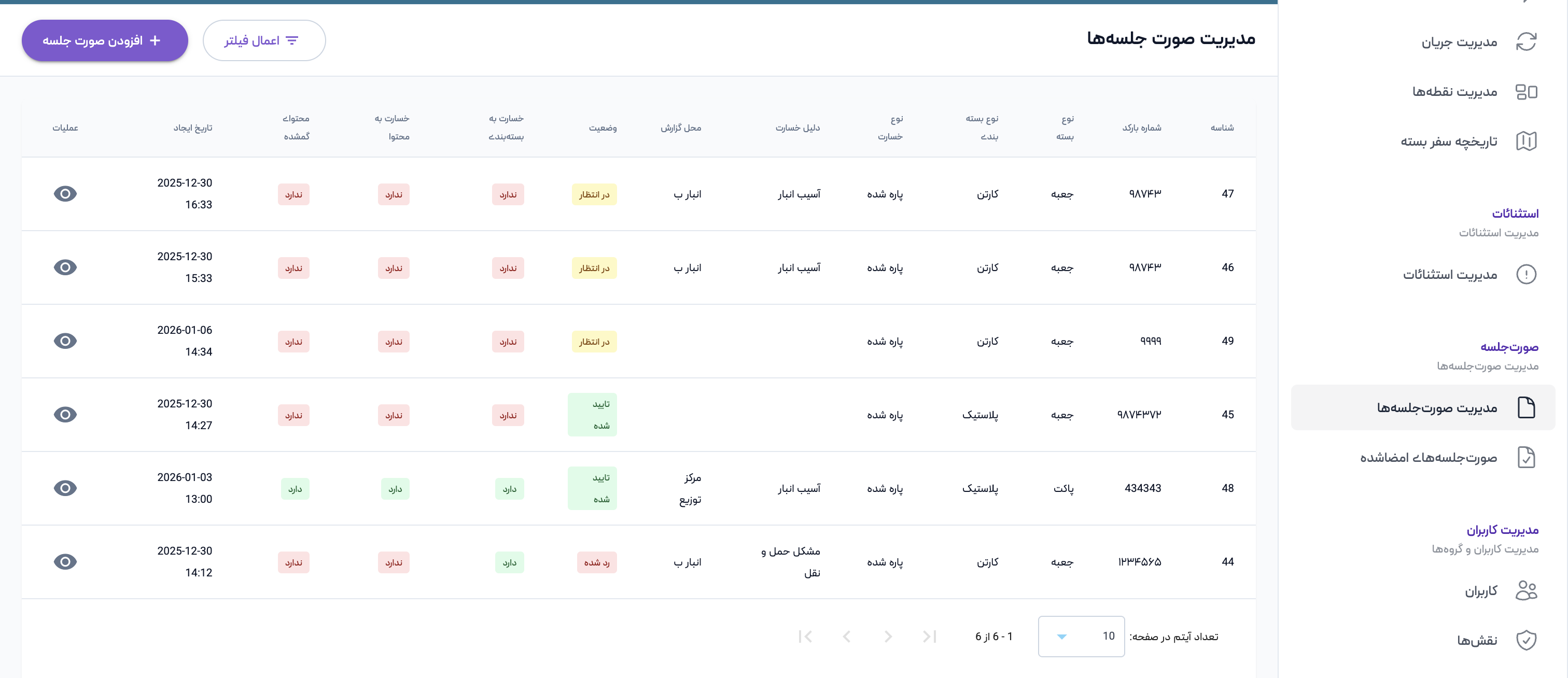 پس از کلیک روی دکمه ذخیره، صورتجلسه ثبت میشود و در لیست صورتجلسات نمایش داده میشود.