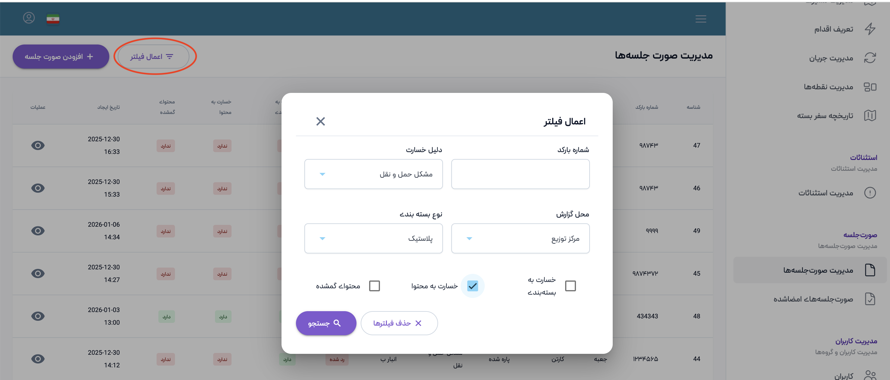 برای فیلتر کردن لیست صورتجلسات و نمایش هدفمندتر آنها با کلیک روی دکمه اعمال فیلتر و پر کردن اطلاعات مربوطه دادهها دقیقتر و مطابق نیاز نمایش داده میشوند.