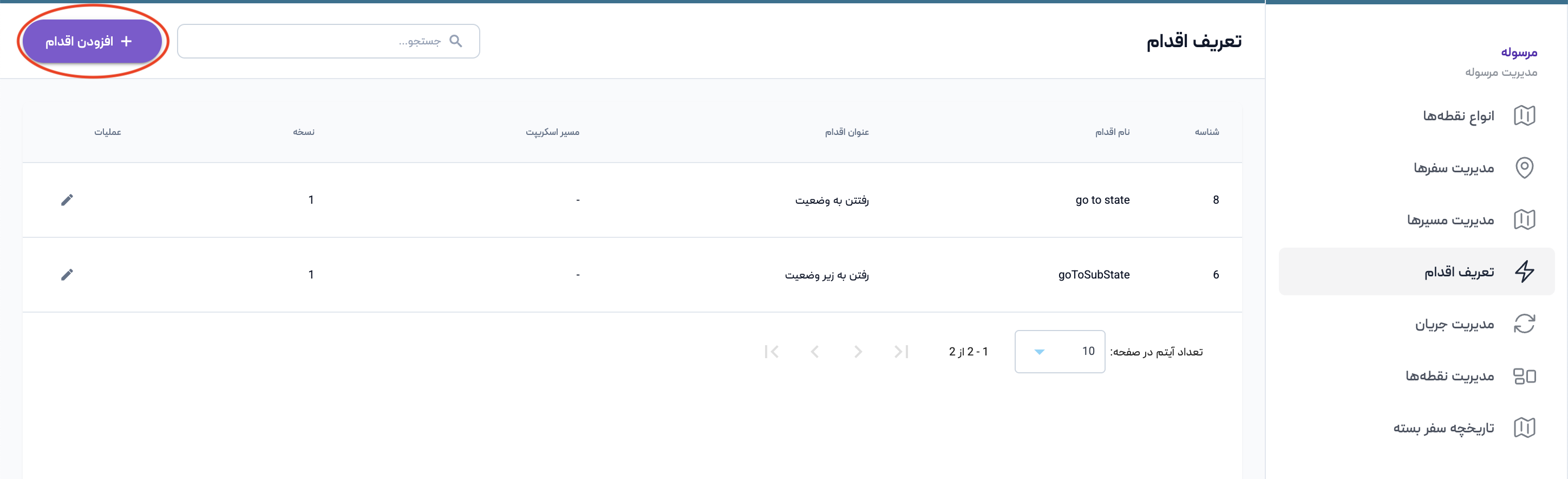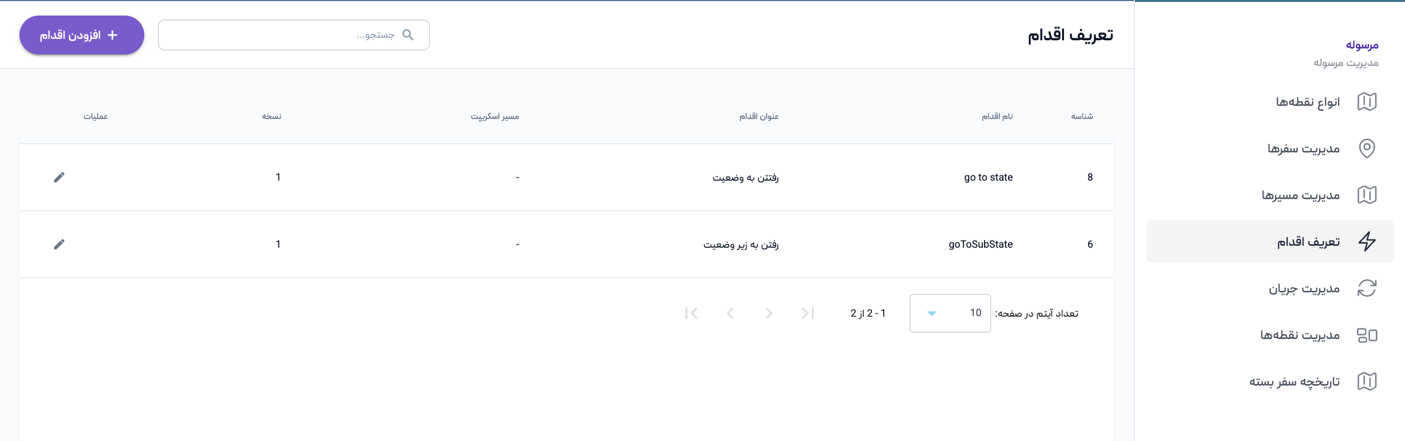 برای تعریف اقدام، پس از ورود به سامانه از منوی مرسوله وارد بخش تعریف اقدام شوید. در این صفحه، فهرست تمامی اقدامهای تعریفشده نمایش داده میشود و امکان ایجاد و ویرایش آنها وجود دارد.