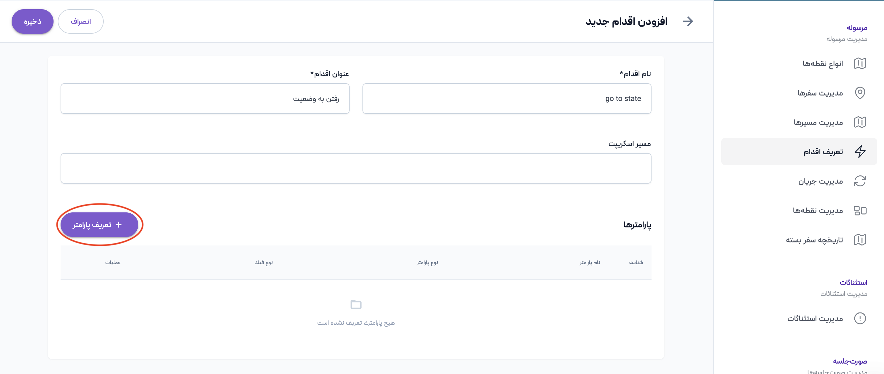 در صفحه باز شده باید نام اقدام، عنوان اقدام، مسیر اسکریپت و پارامترها را تعریف کنید. برای ایجاد پارامترها روی دکمه تعریف پارامتر کلیک کنید.