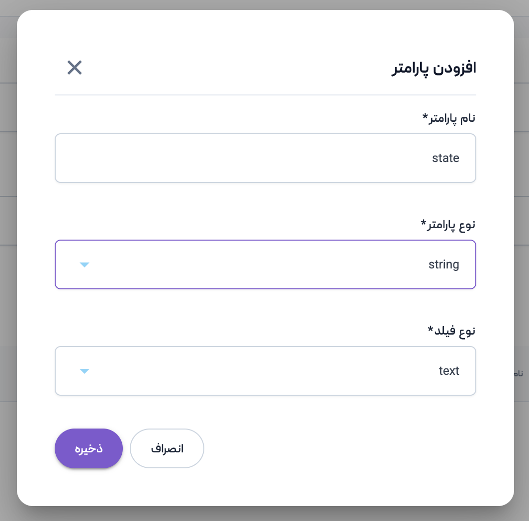 نام پارامتر، نوع پارامتر و نوع فیلد را وارد کرده و دکمه ذخیره را انتخاب نمایید تا پارامتر دلخواهتان ایجاد شده و در لیست پارامترها اضافه شود.