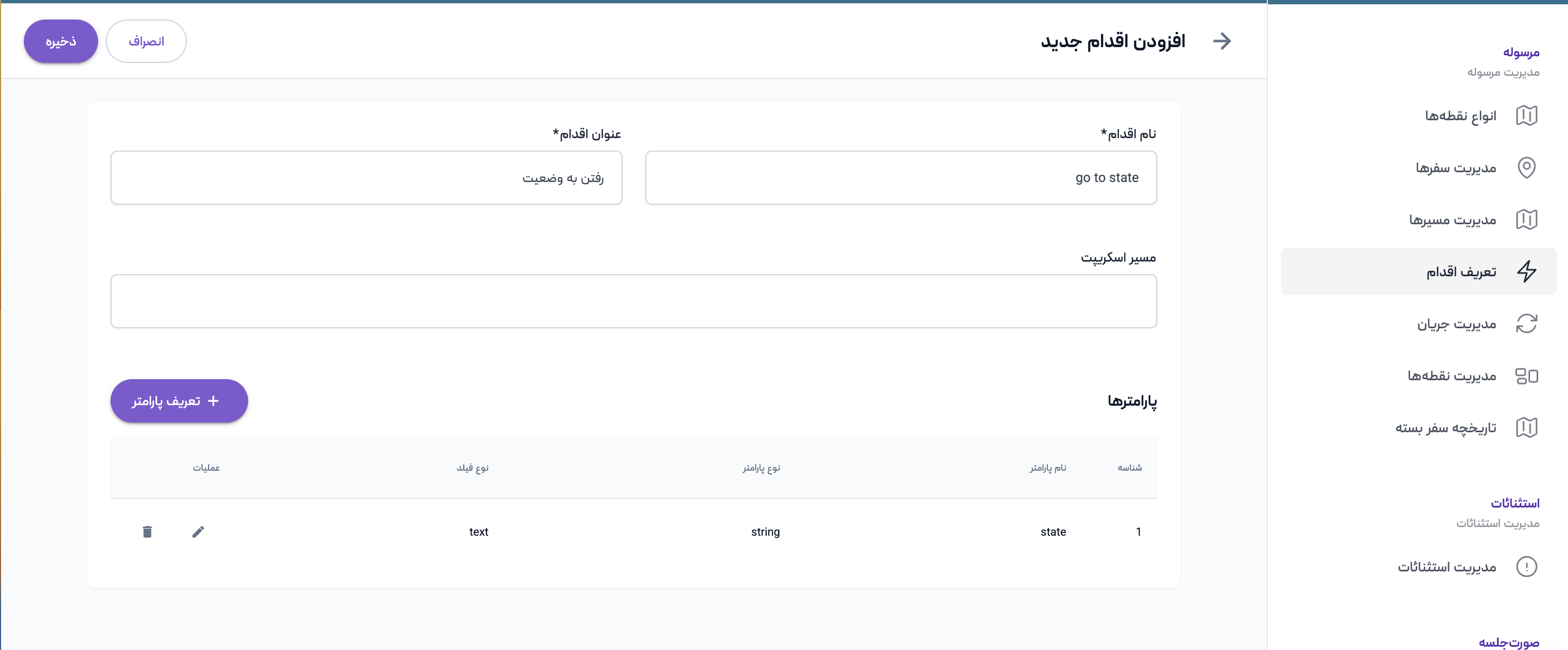 پس از تکمیل اطلاعات مدنظر، دکمه ذخیره را انتخاب نمایید تا اقدام مدنظر ایجاد شود. اکنون در لیست اقدامات قابل مشاهده است.